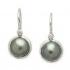 Button shape freshwater pearls in 8.5-9mm in black color are set in rhodium plated silver in a dangle earring finding and with white topaz accents.